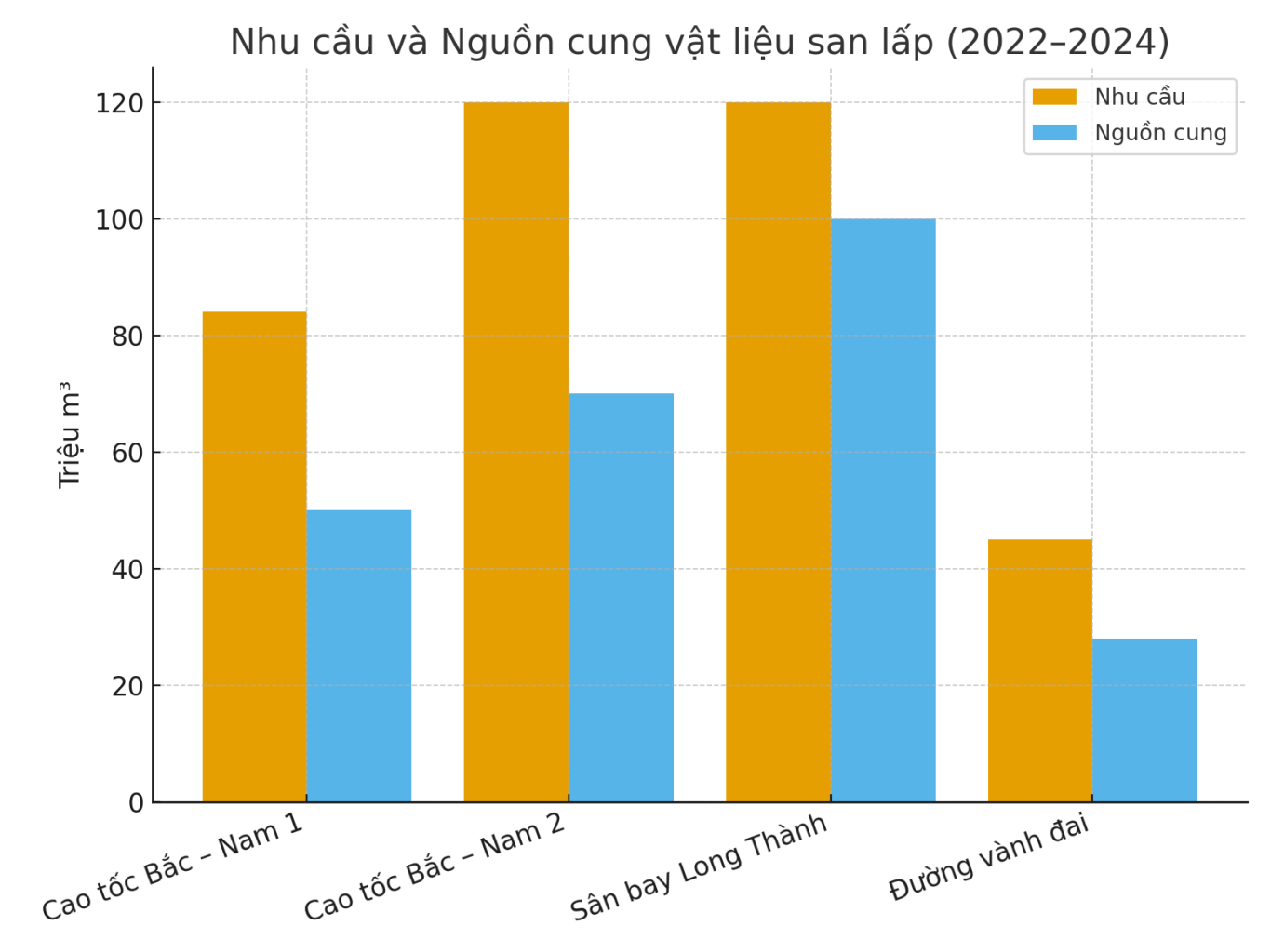 Theo Bộ Giao thông vận tải (2022) [5], nhu cầu vật liệu san lấp cho các dự án hạ tầng trọng điểm quốc gia trong giai đoạn 2022-2024 tăng mạnh, song nguồn cung hợp pháp chưa đáp ứng yêu cầu. Cụ thể, tuyến cao tốc Bắc - Nam giai đoạn 1 cần khoảng 84 triệu m³ đất đắp nhưng thực tế chỉ có khoảng 50 triệu m³ được cấp phép khai thác hợp pháp, đạt tỷ lệ đáp ứng khoảng 60%, tương đương thiếu hụt gần 34 triệu m³. Đối với giai đoạn 2 của tuyến cao tốc này, nhu cầu dự kiến lên tới 120 triệu m³, song nguồn cung mới đạt khoảng 70 triệu m³ (tương đương 58%), làm gia tăng áp lực lên tiến độ khởi công từ cuối năm 2022. Trong khi đó, dự án sân bay Long Thành giai đoạn 1 có nhu cầu khoảng 120 triệu m³ vật liệu san lấp, nhưng đến năm 2024 mới chỉ có cam kết cung cấp 80-85% khối lượng, tiềm ẩn nguy cơ chậm tiến độ thi công san nền. Tình trạng tương tự cũng xảy ra tại các dự án đường vành đai ở Hà Nội và TP. Hồ Chí Minh, khi nguồn cung vật liệu tại chỗ chỉ đáp ứng khoảng 62% nhu cầu, đòi hỏi phải bổ sung thêm mỏ khai thác mới.