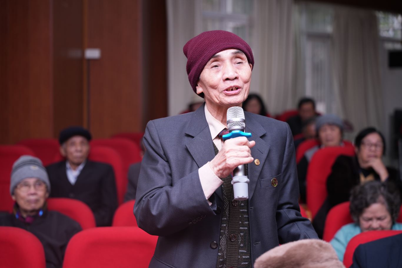 Bác Nguyễn Xuân Hoài, cán bộ hưu trí, chia sẻ cảm xúc và tặng bài thơ tại buổi gặp mặt.