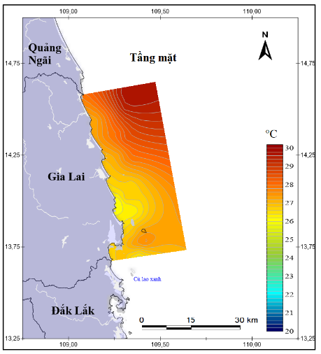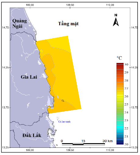 Hình 3. Phân bố nhiệt độ nước biển (°C) vùng biển ven bờ Gia Lai vào mùa gió tây nam (6/2024)