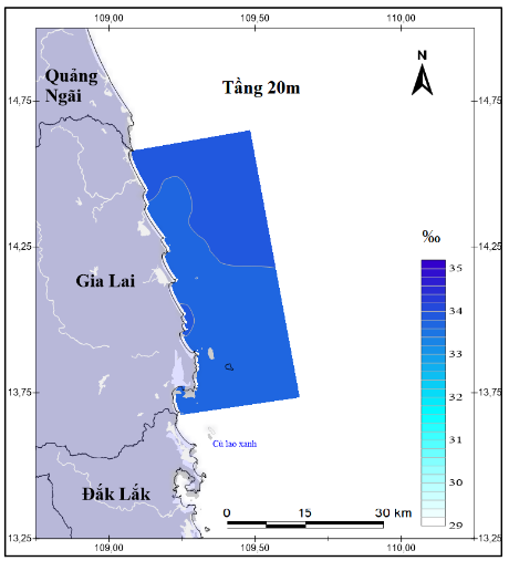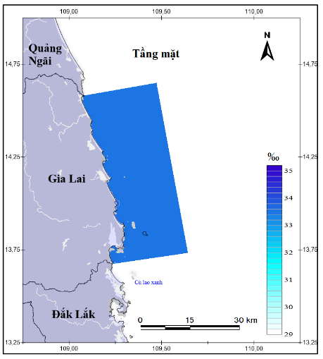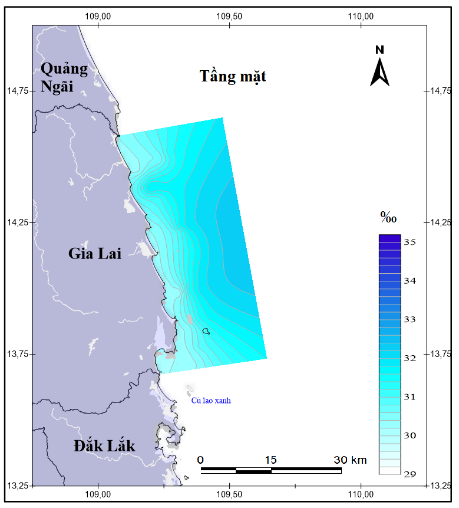 Hình 5. Phân bố độ muối (‰) vùng biển ven bờ Gia Lai vào mùa gió Tây Nam (6/2024)