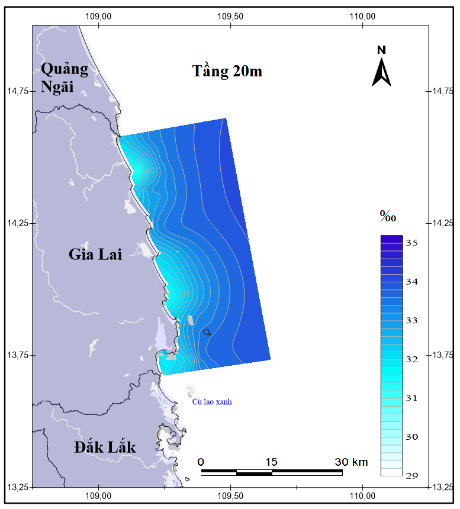 Phân bố độ muối theo phương ngang, trong mùa gió Đông Bắc, trường độ muối tầng mặt xuất hiện dải giá trị thấp ven bờ, giảm xuống dưới 30-31‰, đây là thời kì mùa mưa của khu vực nghiên cứu, các khu vực ven bờ chịu sự tác động của nước nhạt từ lục địa ra. Tại tầng 20m, độ muối ít chịu tác động của khối nước ngọt từ bờ ra, chúng dao động trong khoảng 33-34‰. Ở tầng 50m, độ muối tương đối cao và đồng nhất hơn, dao động quanh 34‰ (Hình 4). Trong mùa gió Tây Nam, trường độ muối duy trì giá trị cao và tương đối đồng nhất ngay từ tầng mặt (khoảng 32-34‰). Tại các tầng sâu hơn (20m và 50m), độ muối tăng nhẹ và phân bố đồng đều (Hình 5).