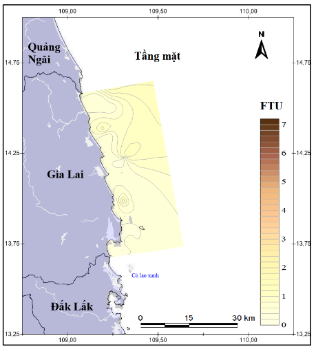 Hình 9. Phân bố độ đục nước biển (FTU) vùng biển ven bờ Gia Lai vào mùa gió Tây Nam (6/2024)