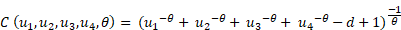 trong đó ui là xác suất biên của từng chỉ số hạn, d=4 là số biến, và θ>0 là tham số phụ thuộc được ước lượng theo phương pháp cực đại khả năng.