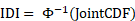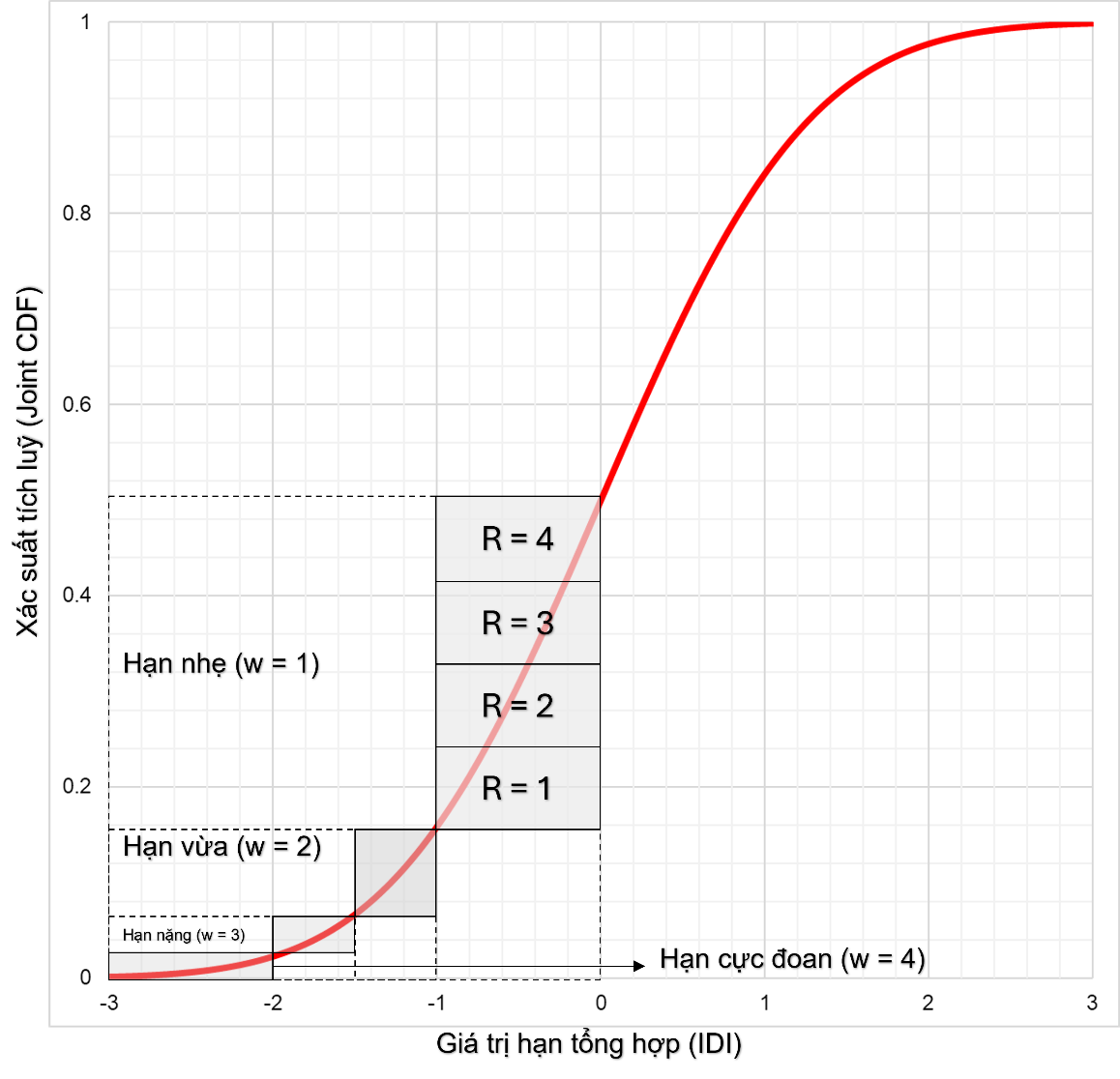 Hàm phân phối tích lũy đồng thời (Joint CDF) thu được từ copula cho biết xác suất xảy ra đồng thời các điều kiện hạn. Giá trị Joint CDF càng thấp thể hiện xác suất cao của tình trạng thiếu hụt nghiêm trọng, trong khi giá trị cao phản ánh điều kiện ẩm ướt. Để thuận tiện trong diễn giải, Joint CDF được chuyển đổi ngược lại về thang chuẩn thông qua hàm phân phối ngược chuẩn (inverse normal), tạo thành chỉ số hạn tổng hợp IDI: