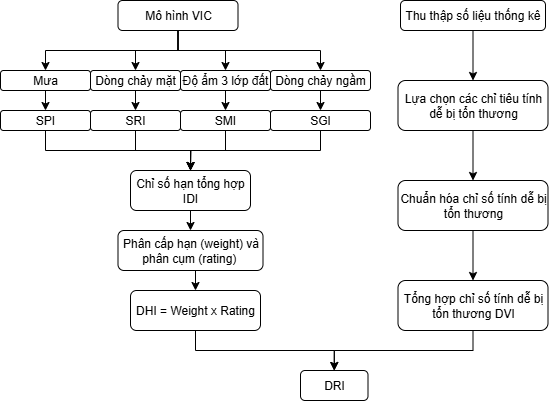 Chỉ số rủi ro hạn hán DRI được xây dựng dựa trên nguyên tắc cơ bản của đánh giá rủi ro thiên tai, trong đó rủi ro được định nghĩa là hàm của DHI và DVI. Hiểm họa đại diện cho khả năng một sự kiện thiên tai xảy ra, trong khi tổn thương thể hiện mức độ bị ảnh hưởng của một hệ thống khi sự kiện đó xảy ra. Cả hai yếu tố này đều đóng vai trò then chốt trong việc xác định mức độ rủi ro tổng thể.