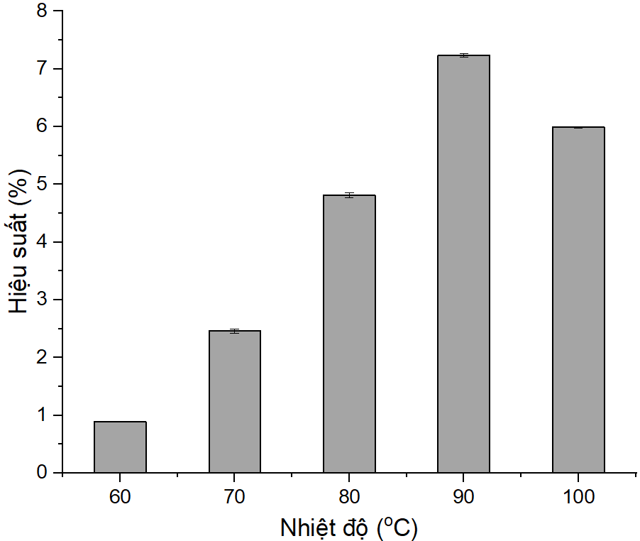 Hiệu suất tăng từ 60°C (0,89 ± 0,01%) đến 90°C (7,23 ± 0,03%, p < 0,05), nhưng giảm tại 100°C (5,99 ± 0,01%, p < 0,01, post-hoc Tukey). Nhiệt độ cao tăng tốc độ khuếch tán và phá vỡ liên kết hydro giữa pectin và thành tế bào, cải thiện hiệu suất (Cui và c.s. 2021). Tuy nhiên, tại 100°C, chuỗi polysaccharide có thể bị thủy phân, giảm hiệu suất (Liu và c.s. 2016). Chen và cộng sự báo cáo 90°C tối ưu cho việc bảo toàn cấu trúc pectin và có hiệu xuất tốt (Chen và c.s. 2021). Nhiệt độ 90°C là điểm cân bằng giữa hiệu suất và bảo toàn cấu trúc pectin, phù hợp cho quy mô công nghiệp.