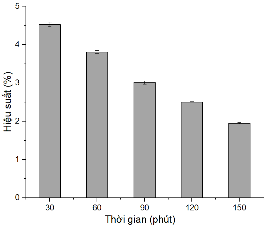 Hiệu suất đạt cao nhất tại 30 phút (4,53 ± 0,06%, p < 0,05), giảm dần khi kéo dài (1,95 ± 0,02% tại 150 phút, p < 0,01, post-hoc Tukey). Trong môi trường acid và nhiệt độ cao, pectin dễ bị thủy phân, làm ngắn chuỗi polysaccharide và giảm hiệu suất(Kaya và c.s. 2014). Pasandide và cộng sự báo cáo 30 phút tối ưu cho vỏ kiwi vàng (Pasandide và c.s. 2017). Thời gian ngắn không chỉ tăng hiệu suất mà còn tiết kiệm năng lượng, phù hợp cho sản xuất công nghiệp.