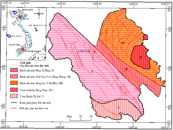 Cấu trúc địa chất Khu vực tỉnh Lào Cai nằm trong phạm vi của 5 đới cấu trúc lớn là: Khối I - Khối Fansipan; Khối II - Khối Núi Con Voi (Sông Hồng); Khối III - Khối Sông Lô (Việt Bắc); Khối IV - Vòm batholit Sông Chảy; Khối V - Vòm riolit Tú Lệ (Hình 1).
