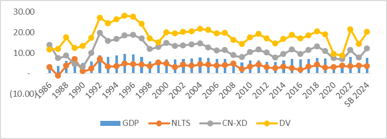 Hình 1. Tăng trưởng GDP phân theo ngành, giai đoạn 1986 - 2024 (%)