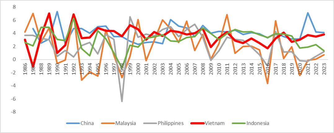 Hình 2. Tốc độ tăng trưởng GDP nông nghiệp Việt Nam so với các nước cùng khu vực (%)