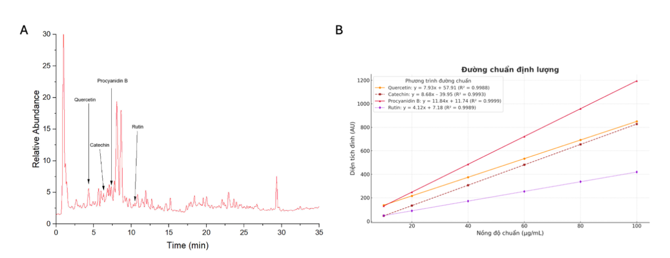 Tổng polyphenol (TPC) được xác định bằng phương pháp Folin–Ciocalteu, đo hấp thụ tại bước sóng 765 nm và biểu diễn dưới dạng mg gallic acid equivalents/g chất khô (mg GAE/g). Tổng flavonoid được đo bằng phương pháp tạo phức với AlCl₃, đọc tại 415 nm và quy đổi theo đơn vị mg quercetin equivalents/g (mg QE/g). Định lượng các hợp chất flavonoid chính như catechin, quercetin, rutin và procyanidin B được thực hiện bằng sắc ký lỏng hiệu năng cao UPLC–DAD với cột C18 và bước sóng phát hiện lần lượt là 280 nm và 360 nm. Các chất chuẩn có độ tinh khiết ≥98% được sử dụng để thiết lập đường chuẩn với hệ số tương quan tuyến tính R² > 0,998.