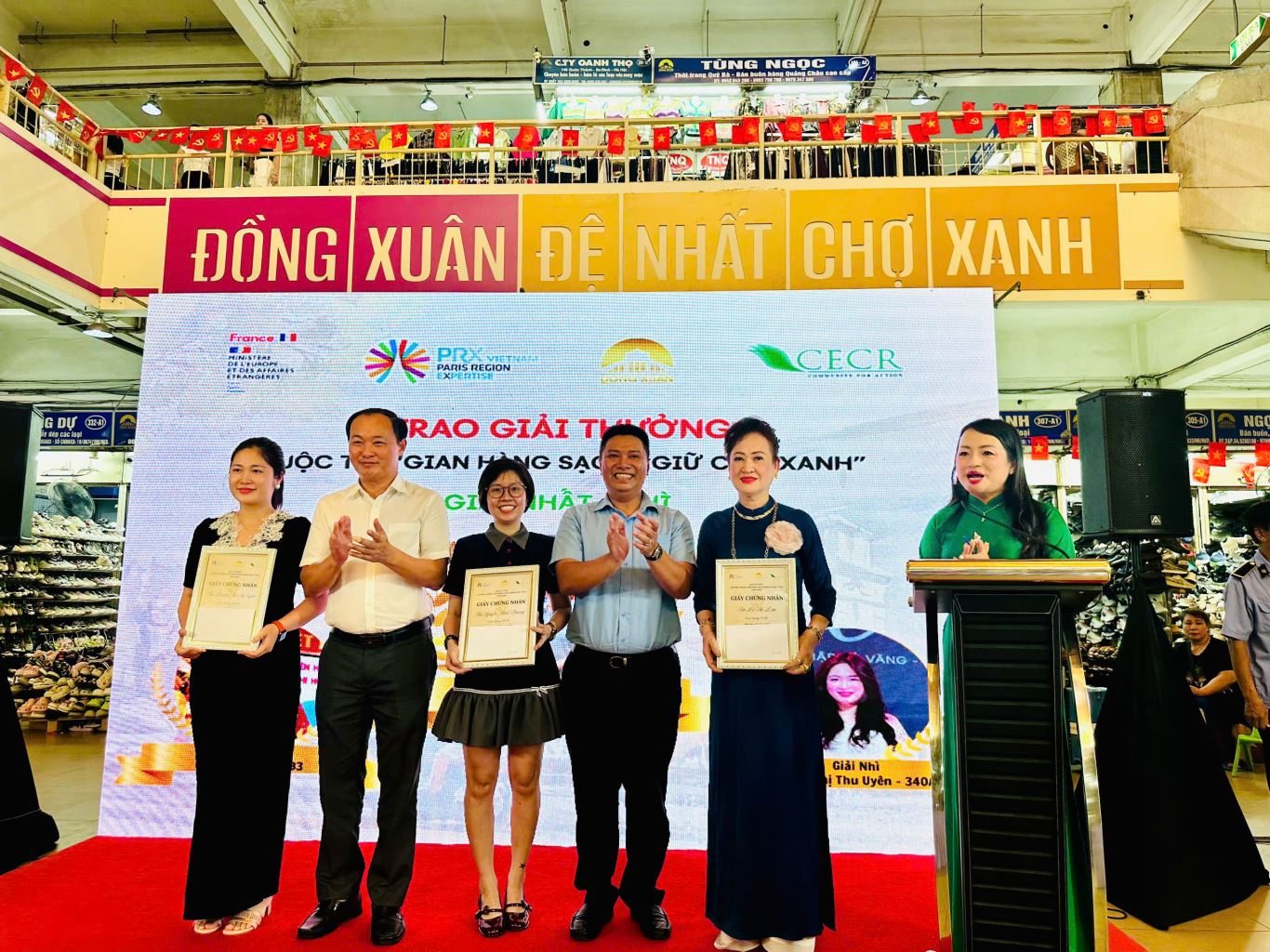 Ban Tổ chức trao giải Nhất và giải Nhì cho các tiểu thương tiêu biểu Cuộc thi Gian hàng Sạch - Giữ chợ Xanh”