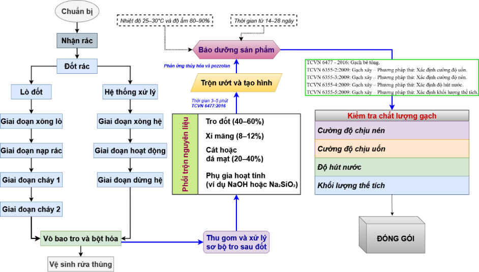 Quy trình sản xuất gạch không nung (Hình 1) gồm các bước: (1) Xử lý sơ bộ tro để loại bỏ tạp chất; (2) Phối trộn nguyên liệu theo tỷ lệ: tro (40 - 60%), xi măng (8 -12%), cát/đá mạt (20 - 40%) và phụ gia; (3) Trộn ướt và ép định hình bằng máy ép thủy lực; (4) Bảo dưỡng sản phẩm trong 14 - 28 ngày ở điều kiện tiêu chuẩn (nhiệt độ 25–30°C, độ ẩm 80 - 90%). Tuy nhiên, vì đây là tro y tế, nên để tăng cường độ nén, giúp gạch nhanh đạt mục tiêu thiết kế, giảm rủi ro nứt vỡ, nâng năng suất và bù trừ trường hợp tro bay kém hoạt tính hoặc chất lượng không ổn định, tỷ lệ phối trộn nghiên cứu lựa chọn là 30% tro bay, 20% xi măng, 50% đá mi và 20% độ ẩm.