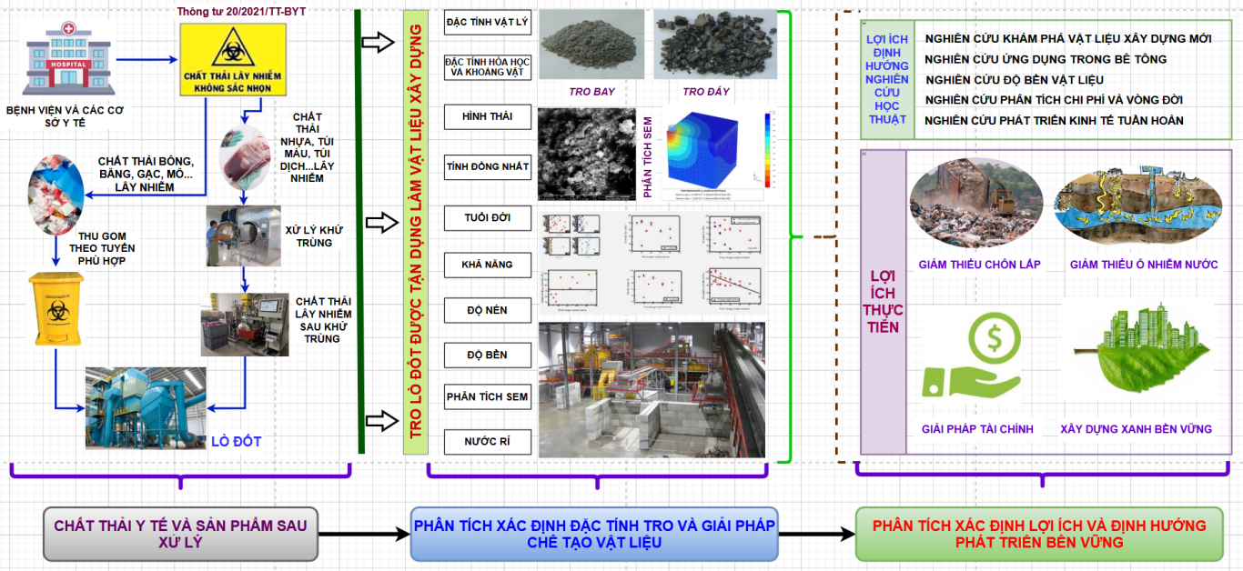 Nghiên cứu tập trung đánh giá tiềm năng tái sử dụng tro đáy từ quá trình đốt CTYT nguy hại tại TP.HCM. Các mục tiêu chính gồm: (i) Phân tích đặc tính hóa lý và khả năng tái sử dụng của tro; (ii) đánh giá ứng dụng trong sản xuất bê tông, gạch không nung, vật liệu nền đường; (iii) so sánh với các tiêu chuẩn Việt Nam (TCVN 6260:2009, TCVN 6477:2016, QCVN 07:2009/BTNMT). Kết quả kỳ vọng khẳng định giá trị tro như nguồn tài nguyên thứ cấp, góp phần giảm chôn lấp, bảo vệ môi trường và thúc đẩy kinh tế tuần hoàn.
