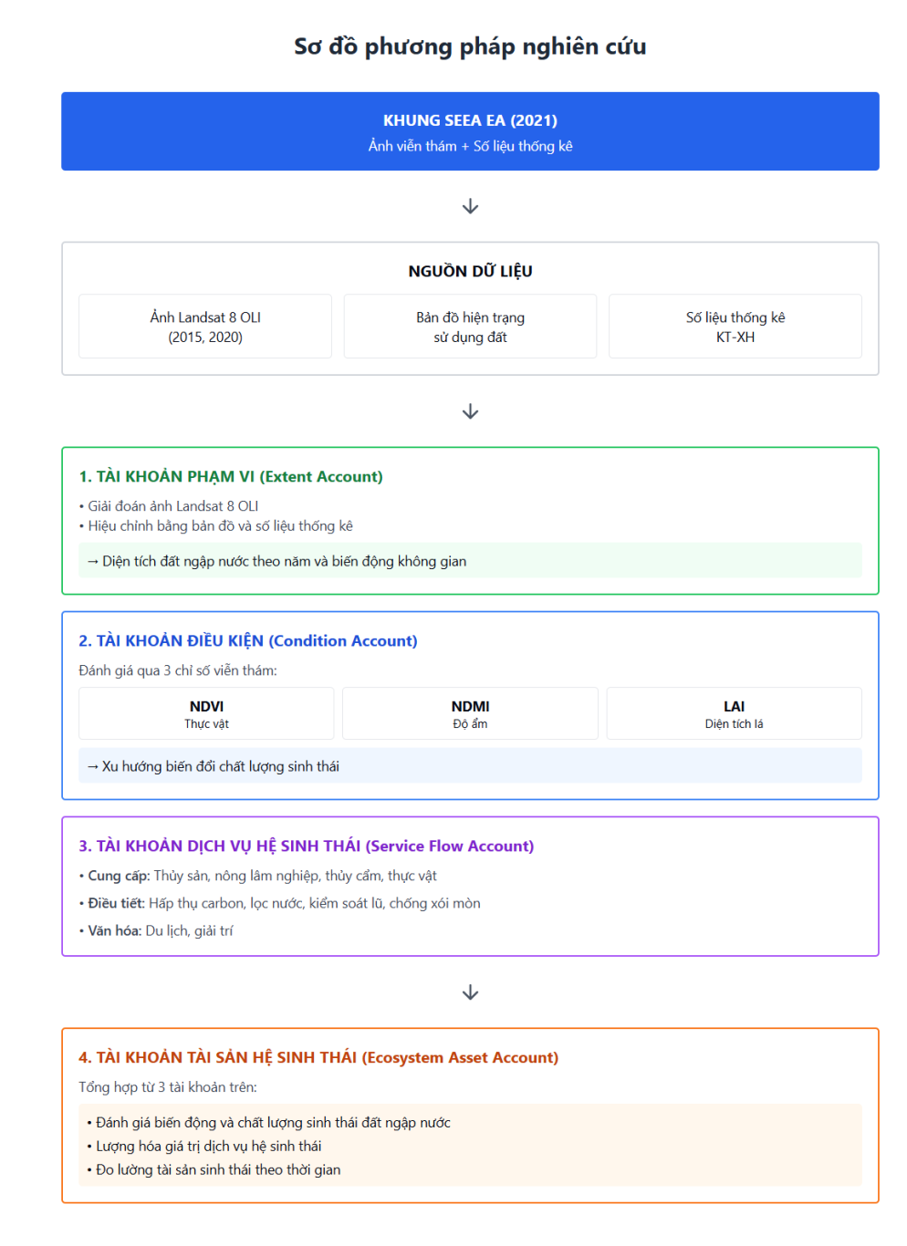 Phương pháp nghiên cứu được triển khai dựa trên khung SEEA EA (2021) kết hợp xử lý ảnh viễn thám và số liệu thống kê kinh tế - xã hội. Các bước tiến hành gồm: