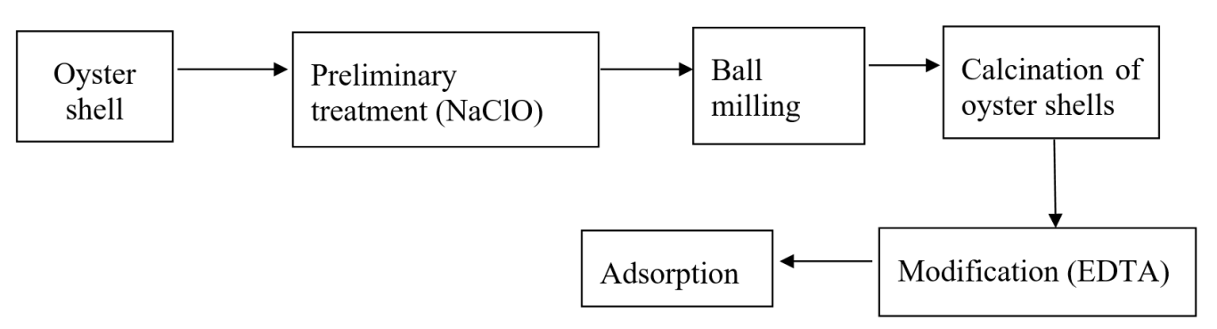 Modification of pretreated oyster shell powder with EDTA was performed as follows: 0.3 g of EDTA was accurately weighed and dissolved in 50 mL of distilled water using a magnetic stirrer at 600C. Subsequently, 3 g of oyster shell powder was added to the solution and stirring was continued for 2 hours. Finally, the oyster shell powder was washed with distilled water, and the solid fraction was collected by filtration. The powder was then oven-dried at 1000C until constant weight.