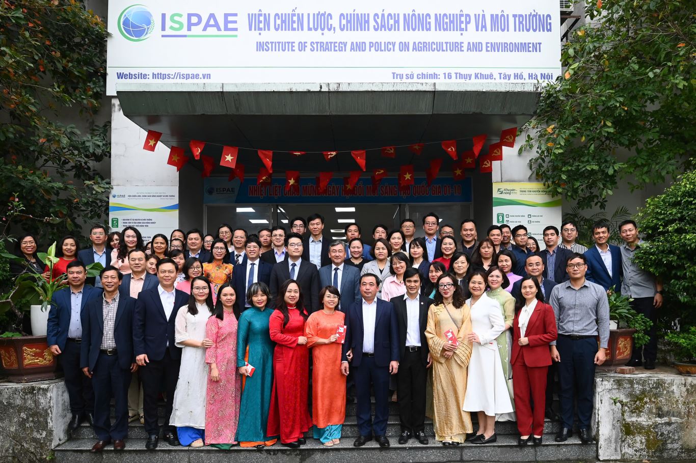 Ủy viên Bộ Chính trị, Bộ trưởng Bộ Nông nghiệp và Môi trường Trần Đức Thắng chụp ảnh lưu niệm cùng lãnh đạo, cán bộ Viện Chiến lược, Chính sách nông nghiệp và môi trường