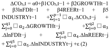 CO₂t = α0 + α1 GROWTHt + α2FDIt + + α3REERt + α4INDUSTRYt + εt (1)
