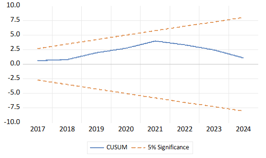 Hình 3. CUSUM stability plots of the ARDL(4, 3, 4, 3, 4)