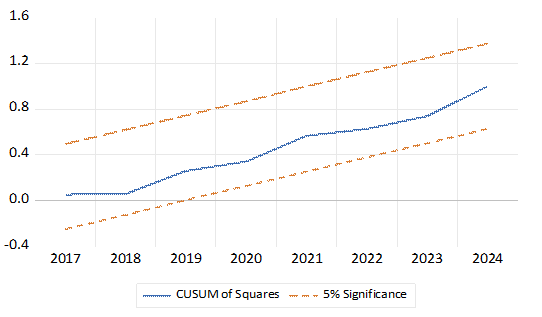 Hình 2 và 3 trình bày các thông số chẩn đoán độ ổn định của mô hình bao gồm phép thử tổng tích lũy của phần dư đệ quy (CUSUM) và phép thử tổng bình phương của phần dư đệ quy (CUSUMSQ), cho thấy các hệ số của mô hình ARDL tuyến tính và phi tuyến ước tính ổn định ở mức ý nghĩa 5%.