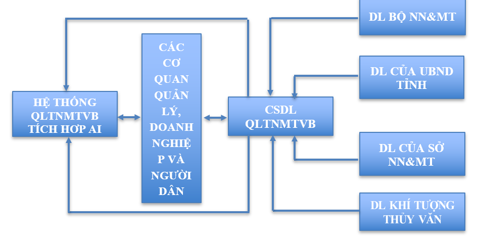 Cơ sở dữ liệu của bài toán được lưu trữ trên hệ thống máy chủ có cấu hình mạnh. Hệ thống quản lý có ứng dụng IoT, Big Data và thuật toán AI để giám sát sự biến động rừng ngập mặn ven biển, các nguyên nhân suy thoái rừng, đưa ra cảnh báo, dự báo, hỗ trợ ra quyết định, cho phép cơ quan quản lý, doanh nghiệp và người dân chủ động xử lý tình huống trong thực tế. Luồng thông tin kết nối các cơ quan quản lý rừng ngập mặn vùng bờ sẽ được chia sẻ theo liên kết dọc và liên kết ngang, cụ thể: