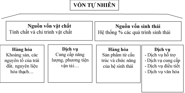 Theo James Aronson (2006), Vốn tự nhiên thường được phân thành bốn nhóm chính, gồm: (1) Vốn tự nhiên tái tạo; (2) không thể tái tạo; (3) có thể tự bổ sung; (4) do con người duy trì, bổ sung. Trong nền kinh tế xanh, vốn tự nhiên được coi không chỉ là nguồn lực đầu vào mà còn cả là kết quả đầu ra được bảo toàn và phát triển cho chu trình kinh tế mới tiếp theo. Vốn tự nhiên bao gồm sinh vật (động và thực vật) và các cấu phần vật chất của tự nhiên, như nước và khoáng sản. Các dịch vụ hệ sinh thái (DVHST) từ các tài sản của HST tạo ra các lợi ích (Costanza et al. 1997; Millennium Ecosystem Assessment 2005), như lương thực, nước, các lợi ích giải trí và văn hóa, điều tiết khí hậu, điều tiết chất lượng không khí và kiểm soát dịch bệnh). Để đảm bảo các dịch vụ này tiếp tục hỗ trợ phúc lợi và cuộc sống con người, các tài sản nguồn vốn tự nhiên này cần được bảo tồn.