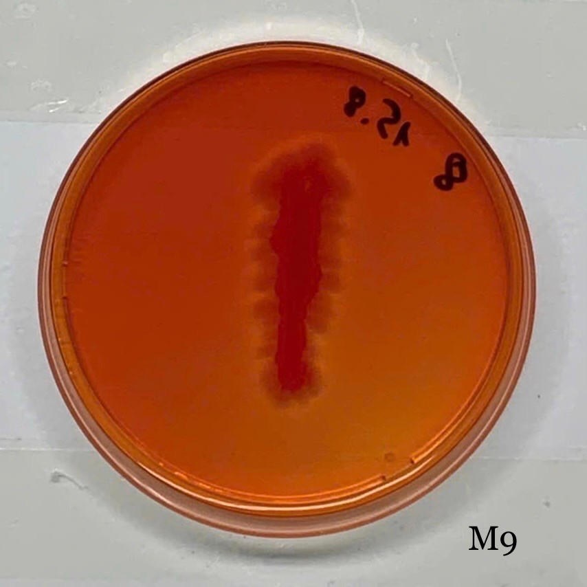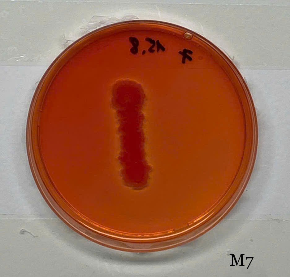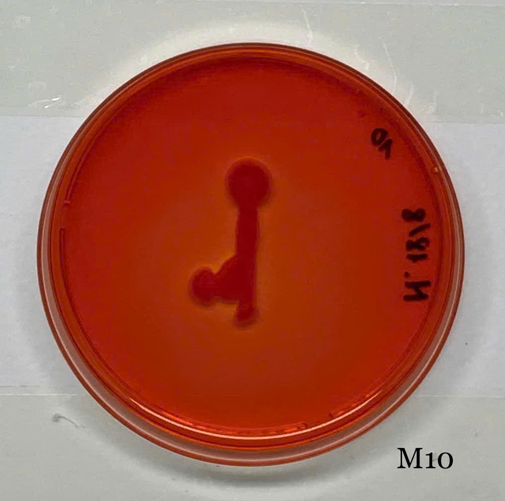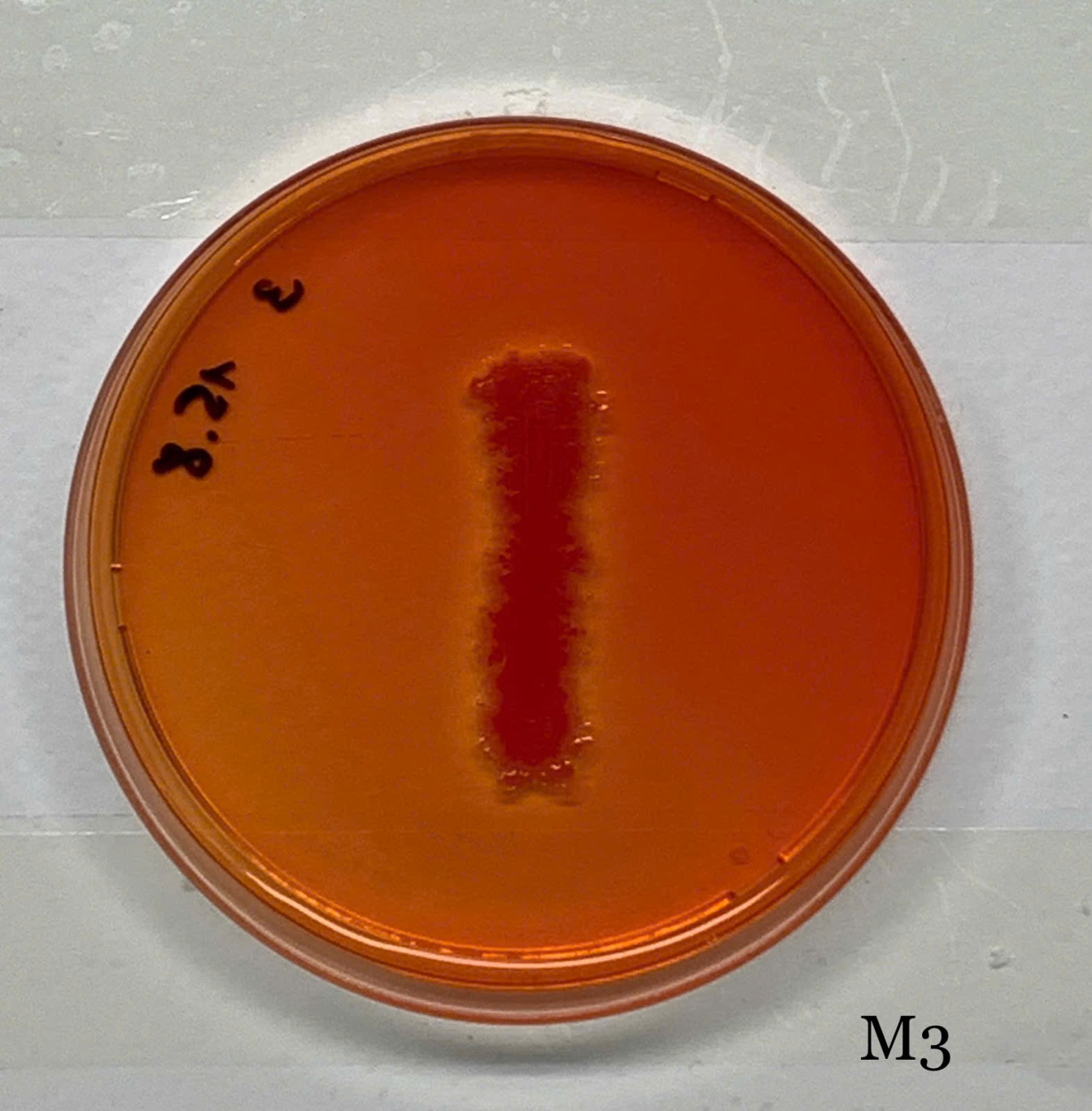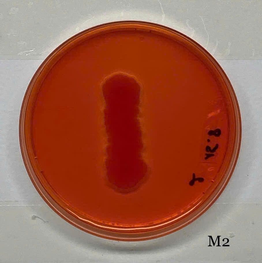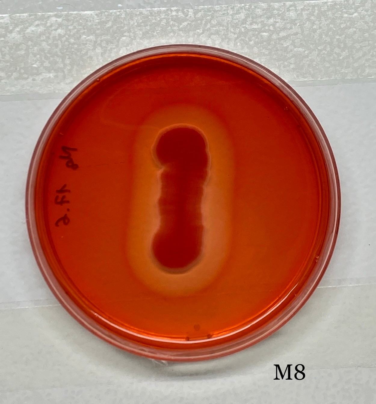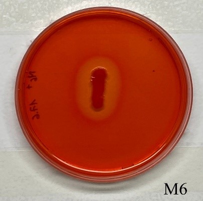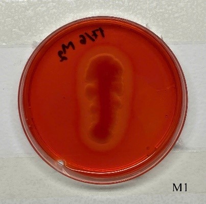 The qualitative screening on MSM agar supplemented with Congo Red showed that the bacterial isolates exhibited halo diameters ranging from 22 mm to 46 mm. Among them, strain M10 displayed the lowest decolorization activity, with a halo diameter of 22 mm, whereas strains M1 and M8 demonstrated the strongest decolorization capability, forming clear zones of 46 mm and 44 mm, respectively. These results indicate substantial variability in dye-degrading potential among the isolates and support the selection of the most efficient strains for further molecular identification and characterization