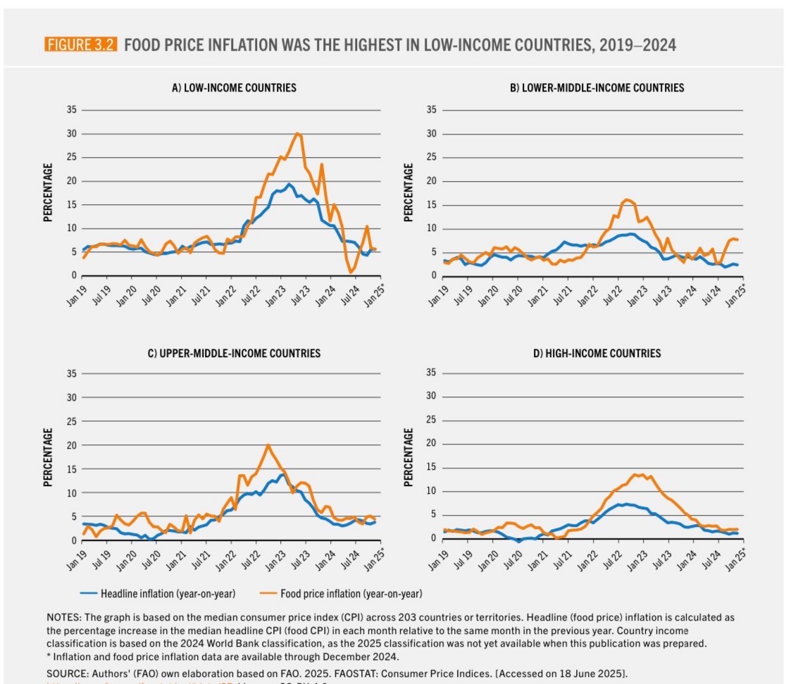 The SOFI 2025 report serves as a stark reminder that poverty, hunger, and environmental instability are deeply intertwined, requiring global coordination beyond singular sector responses. This year’s report reaffirms that while food price inflation remains a pressing concern, it is not undefeatable. Sustained investments, strengthened policy coordination, greater transparency, enhanced policy focus on supporting healthy diets, and continued institutional innovation will be vital in building resilience to future shocks. The lessons of the past several years offer a roadmap for addressing both the immediate impacts of food price inflation on food security and nutrition, and the medium-term goal of achieving SDG 2 and affordable healthy diets for all.