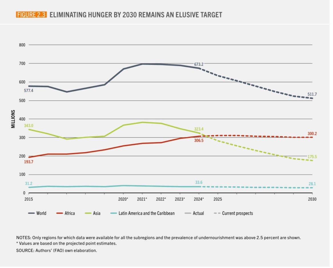 Despite the global hunger rate dropping for the second consecutive year since the peak of the COVID-19 pandemic, the world remains significantly off-track to eliminate hunger and malnutrition by 2030. This apparent improvement is overshadowed by critical regional disparities: