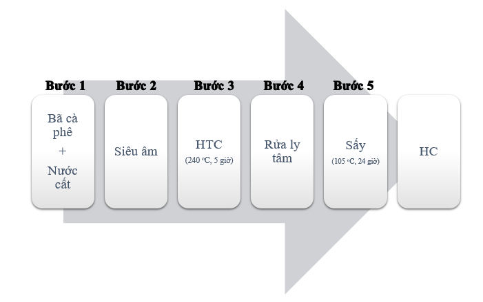 Bã cà phê sau khi thu gom sẽ được rửa bằng nước cất và acetone để loại bỏ các tạp chất và được sấy khô ở 80oC trong 24 giờ để loại bỏ độ ẩm. Sau đó bã cà phê sẽ được sàng qua sàng 2x2 mm để đồng nhất kích thước. Hydrochar (HC) được tổng hợp thông qua quá trình HTC bã cà phê. Quy trình chi tiết tổng hợp HC được trình bày trong Hình 1. Cụ thể, một lượng bã cà phê được cân và cho vào teflon 100 mL. Sau đó, thêm vào một lượng nước cất để độ ẩm của hỗn hợp đạt 80%. Tiếp theo, hỗn hợp được khuấy trộn và siêu âm để đạt được trạng thái đồng nhất và tiến hành quá trình thủy nhiệt ở nhiệt độ khoảng 240℃ trong các khoảng thời gian 5 giờ. Khi phản ứng kết thúc, autoclave vẫn được để trong lò nung và làm nguội tự nhiên đến khi đạt nhiệt độ phòng. Sau quá trình HTC, hỗn hợp được rửa bằng cách ly tâm với nước cất và acetone và sấy ở 105℃ qua đêm thu được sản phẩm HC.