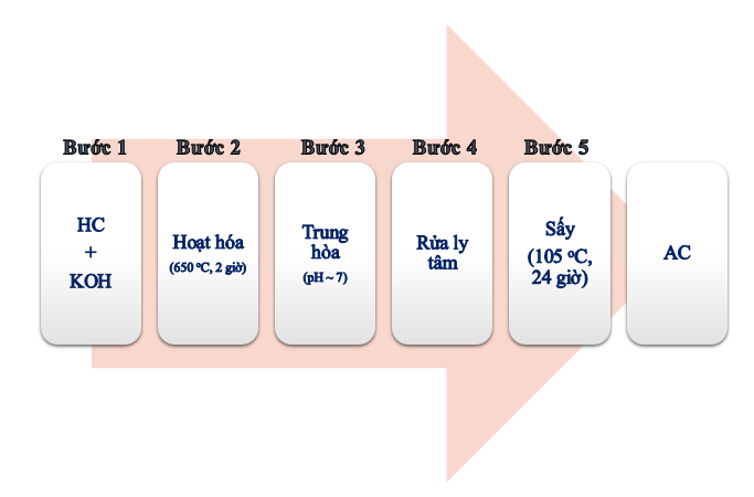 Hình 2 mô tả quy trình tổng hợp than hoạt tính từ HC của bã cà phê. Đầu tiên, trộn HC với KOH theo tỉ lệ khối lượng HC:KOH nhất định vào một cốc phản phản ứng bằng gốm. Sau đó, cốc phản ứng được chuyển vào lò nung và được gia nhiệt đến khoảng nhiệt độ 650°C trong 2 giờ dưới môi trường khí trơ. Khi kết thúc phản ứng, mẫu vẫn được để trong lò nung và làm nguội tự nhiên cho đến khi đạt được nhiệt độ phòng. Sau khi lấy mẫu ra khỏi lò nung, AC được trung hòa về pH xấp xỉ 7 bằng dung dịch HCl. Sau đó, hỗn hợp trên được rửa sạch bằng cách ly tâm nhiều lần với nước cất và acetone. Sau quá trình ly tâm, AC được sấy khô ở 105°C trong vòng 24 giờ để loại bỏ độ ẩm và được bảo quản trong tủ hút ẩm.