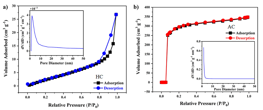 Diện tích bề mặt và kích thước lỗ rỗng của HC và AC được xác định bằng các thí nghiệm hấp phụ - giải hấp N2 bằng phương pháp đo BET (Brunauer-Emmett-Teller) [21]. Hình 3 biểu thị đường đẳng nhiệt hấp phụ - giải hấp N2 của HC và AC tổng hợp được.