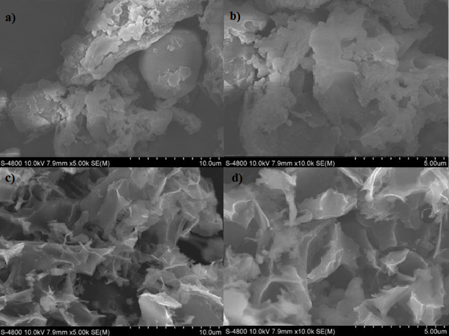 Tiếp đến, kết quả phân tích SEM trong Hình 4 góp phần đánh giá rõ ràng hơn về hình thái bề mặt của HC và AC tổng hợp. Kết quả cho thấy những thay đổi mạnh về cấu trúc hình thái sau quá trình HTC và hoạt hóa hóa học. Sau quá trình HTC, bề mặt HC có khá đặc và ít lỗ xốp, bề mặt hơi gồ ghề và nhám (Hình 4a, b). Sự thay đổi này là do sự phân hủy các thành phần hữu cơ trong cấu trúc CS như cellulose, hemicellulose và lignin thông qua quá trình thủy nhiệt. Sau khi hoạt hóa bằng KOH, bề mặt AC (Hình 4c, d) phát triển cấu trúc xốp lớn hơn, điều này góp phần làm tăng diện tích bề mặt.
