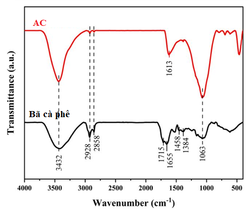 Dựa vào kết quả FT-IR của bã cà phê và AC trong Hình 5 ta có thể thấy, sự hiện diện trong phổ của bã cà phê giữa 3200 và 3600 cm-1 được cho là do dao động kéo giãn O-H trong các phân tử cellulose, hemicellulose và lignin [23]. Các dải sóng tại 2928 và 2858 cm-1 tương ứng với các dao động kéo giãn của nhóm CH3 và CH2 trong hydrocarbon bão hòa [24]. Đặc điểm của nhóm carbonyl trong phổ của bã cà phê được thấy ở 1715 cm-1 (O=C-O) và 1653 cm-1 (C=O), cho thấy sự hiện diện của lignin [25]. Các dải này gần như biến mất hoặc giảm trong phổ AC do quá trình HTC và hoạt hóa hóa học. Bên cạnh đó, các dao động kéo giãn của nhóm C=C trong vòng thơm được quan sát thấy ở 1613 cm-1, đúng như dự kiến. Sự hấp thụ mạnh quan sát được trong vùng 1000-1200 cm-1 tương ứng với chế độ kéo dài C-O thơm của C-OH và nhóm carboxyl [26]. Những kết quả này chỉ ra rằng quá trình HTC và hoạt hóa dẫn đến sự giảm nồng độ các nhóm cacbon chứa oxy trên bề mặt AC.