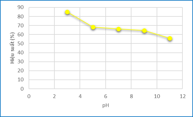 Độ pH đã được nghiên cứu là có tác động đến các đặc tính bề mặt của vật liệu và quá trình hình thành các gốc tự do, do đó ảnh hưởng rất lớn đến việc loại bỏ các chất ô nhiễm [27]. Giá trị pH được khảo sát trong nghiên cứu này là 3, 5, 7, 9, 11. Phản ứng diễn ra ở nhiệt độ phòng với nồng độ TC ban đầu là 30ppm, liều lượng AC thêm vào là 1.0 g/L và phản ứng hấp phụ được diễn ra trong 60 phút.