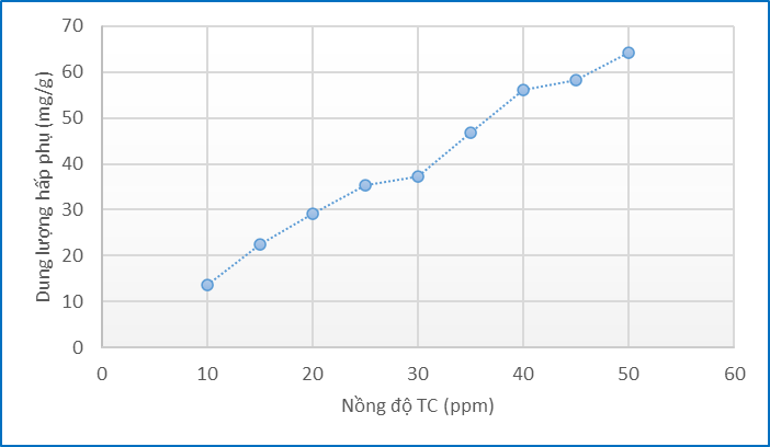 Hình 8 mô tả ảnh hưởng của nồng độ TC ban đầu đến hiệu quả xử lý của AC tổng hợp được. Có thể thấy, khi nồng độ TC tăng từ 10 ppm lên 50 ppm thì dung lượng hấp phụ sẽ tăng từ 13.68 mg/g lên 64.27 mg/g. Điều đó cho thấy khi nồng độ chất ô nhiễm TC quá ít sẽ dẫn đến sự tương tác giữa các phân tử chất ô nhiễm và bề mặt AC bị hạn chế, do đó hiệu quả hấp phụ sẽ không cao. [30]