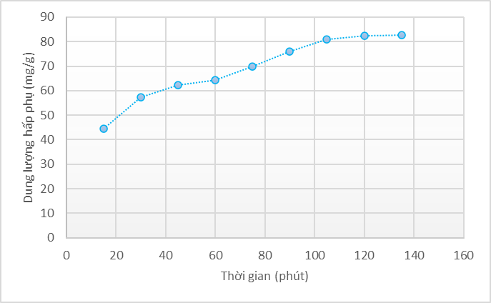 Sự hấp phụ TC của AC tại các thời điểm khác nhau được thực hiện bằng cách thay đổi thời gian hấp phụ từ 15 đến 135 phút. Hình 9 cho thấy, ảnh hưởng của thời gian tiếp xúc đến sự hấp phụ TC trên AC.