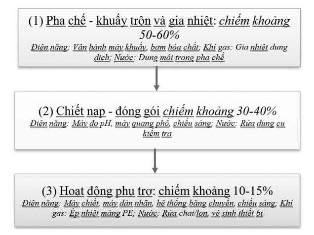 Việc phân bố tiêu thụ năng lượng theo công đoạn được ước tính dựa trên tổng công suất định mức của các thiết bị chính và thời gian vận hành trung bình theo ca; kết quả được đối chiếu và hiệu chỉnh thông qua khảo sát hiện trường và ý kiến cán bộ kỹ thuật. Trên cơ sở đó, các khoảng tỷ lệ tiêu thụ theo công đoạn (pha chế-gia nhiệt khoảng 50-60%; chiết rót-đóng gói khoảng 30-40%) được sử dụng để nhận diện tương đối các điểm nóng năng lượng phục vụ định hướng giải pháp SXSH, không hàm ý kết quả đo đếm chính xác tuyệt đối theo công đoạn.