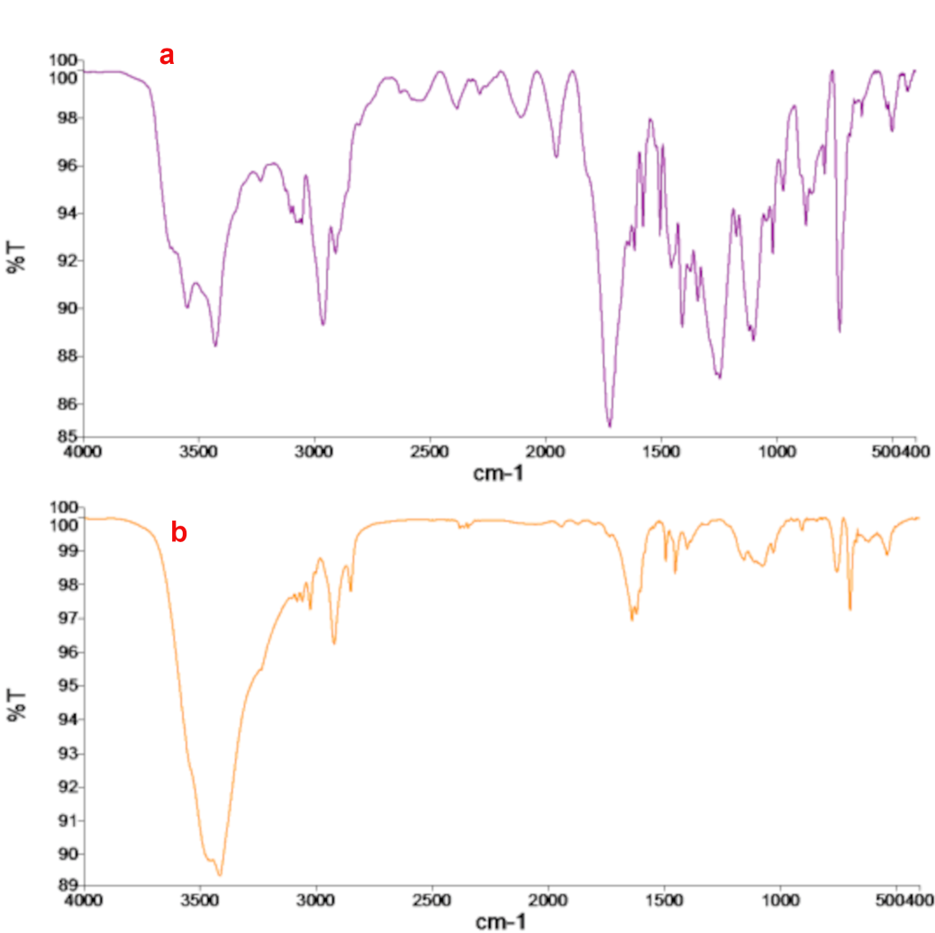 Fig 1. Fourier-transform infrared spectroscopy analysis: a. Chitosan - PVA membrane, b. Chitosan - PVA membrane immersed in green tea extract