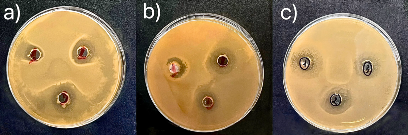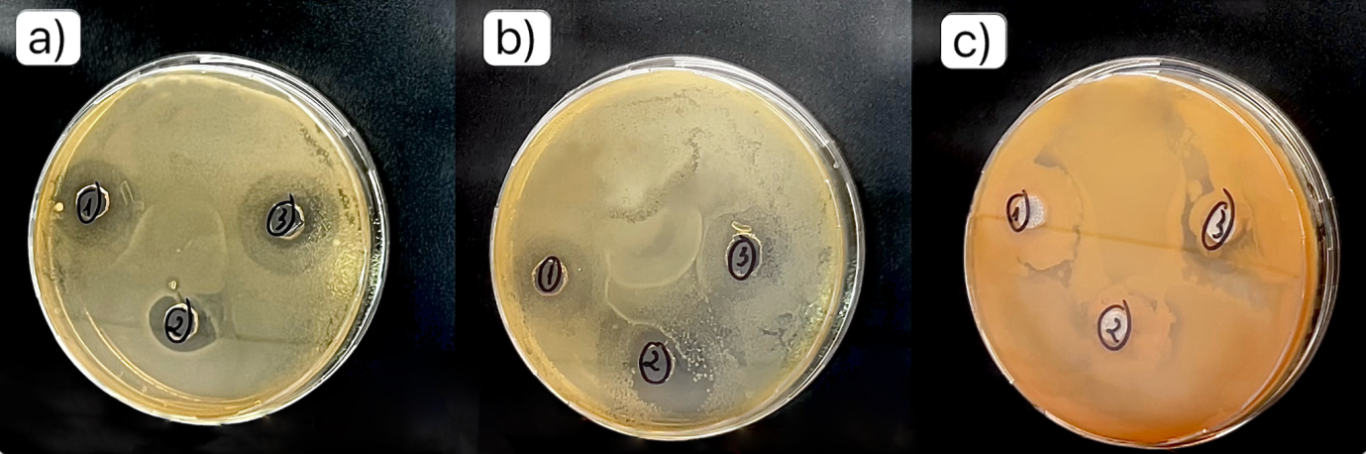 Fig 3. Image of measuring the diameter of the E. coli sterile zone of Chitosan – PVA film mixtures with scale bars of a) 3:1 w/w, b) 1:1 w/w, c) 1:3 w/w