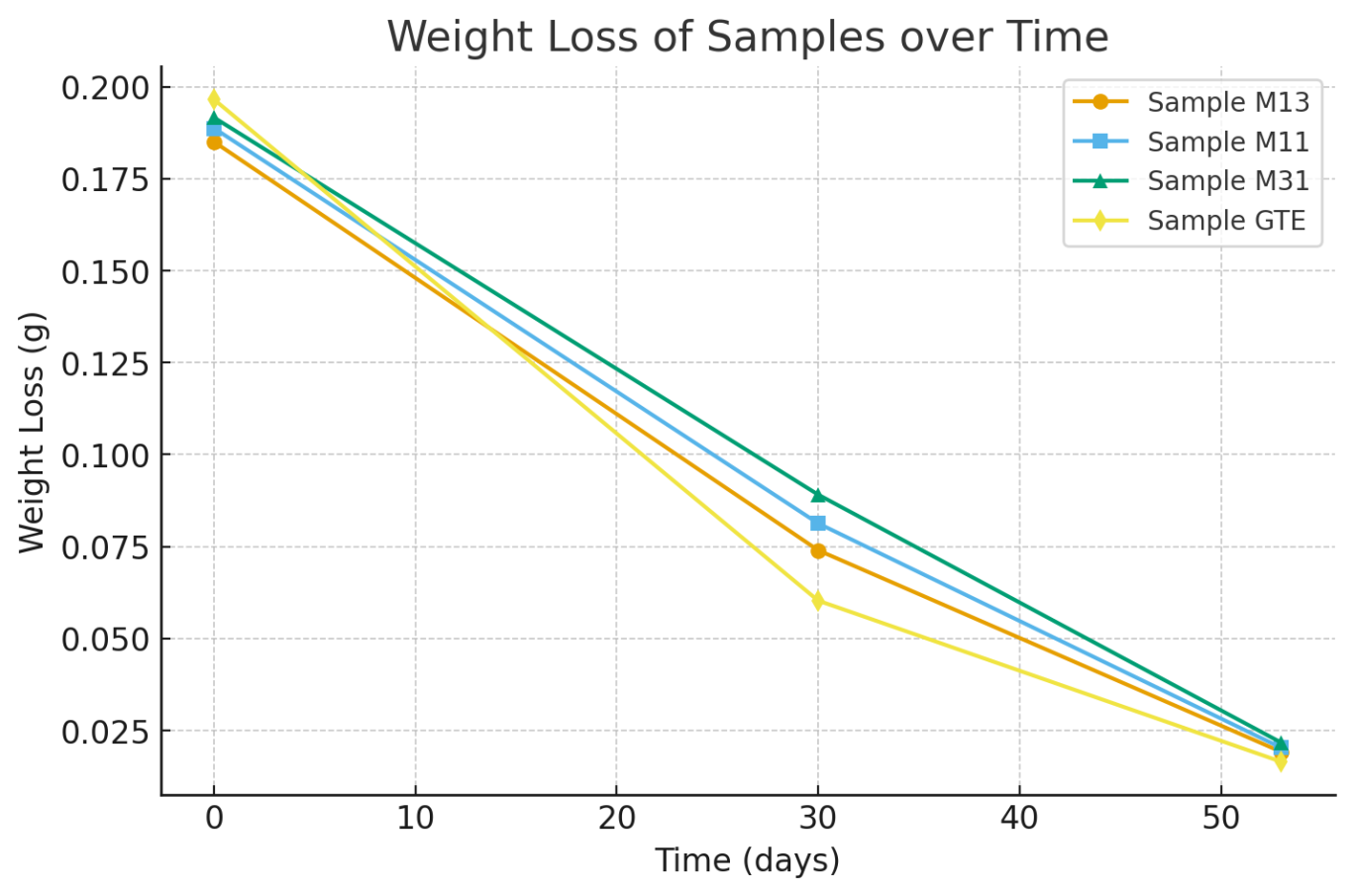 As mentioned earlier, biodegradable active packaging is the main focus of current food packaging research and development. Accordingly, the aim of this study is to develop an environmentally friendly active film from chitosan combined with aqueous green tea extract as a natural antioxidant. The possibility of improving the antioxidant properties of chitosan films is to combine with antioxidant agents (Muñoz-Tebar et al., 2023). The results of the biodegradation test in Table 3 and Fig 5 showed that each sample had a clear tendency to decrease in mass and there were significant differences at each time point. The Chitosan – PVA sample with a ratio of 1:3 w/w, M13, after 30 days, the mass decreased from the initial 0.1850g to 0.0740g, equivalent to 60% decomposition and only 0.0192g on day 53, reaching 89.62% decomposition. The Chitosan – PVA sample with a ratio of 1:1 w/w, M11, decreased from 0.1887g to 0.0813g after 30 days (56.92% decomposition) and 0.0203g after 53 days (89.24% decomposition). The Chitosan – PVA sample with a ratio of 3:1 w/w, M31, had a mass of 0.1916g, after 30 days had a decomposition rate of 53.5% (0.0891g) and decomposed to 88.67% in the next 23 days (remaining 0.0217g) Notably, the GTE sample had the highest initial mass of 0.1965g but after being buried in the ground, the sample mass decreased the fastest, only 0.0603g on day 30 (69.31% decomposition) and 0.0165g on day 53 (91.60% decomposition). This shows that the MGTE film showed the highest early decomposition rate but the largest decrease rate in the later phase, suggesting that as a good source of polyphenols, GTE can be used as an active agent and incorporated into the film. This biodegradability is due to cellulose and glycerol, which contain O–H groups that can bond together and are able to bind moisture from the air, helping them to degrade quickly (Mashuni et al., 2022). It can be concluded that the biodegradable plastic from Chitosan, PVA and GTE has met the standard because the biodegradation test met the international standard (ASTM 5336).