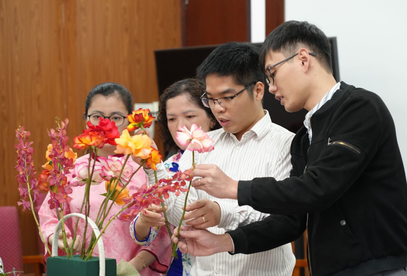 Các cán bộ nam khéo léo thực hiện tác phẩm cắm hoa tại Hội thi