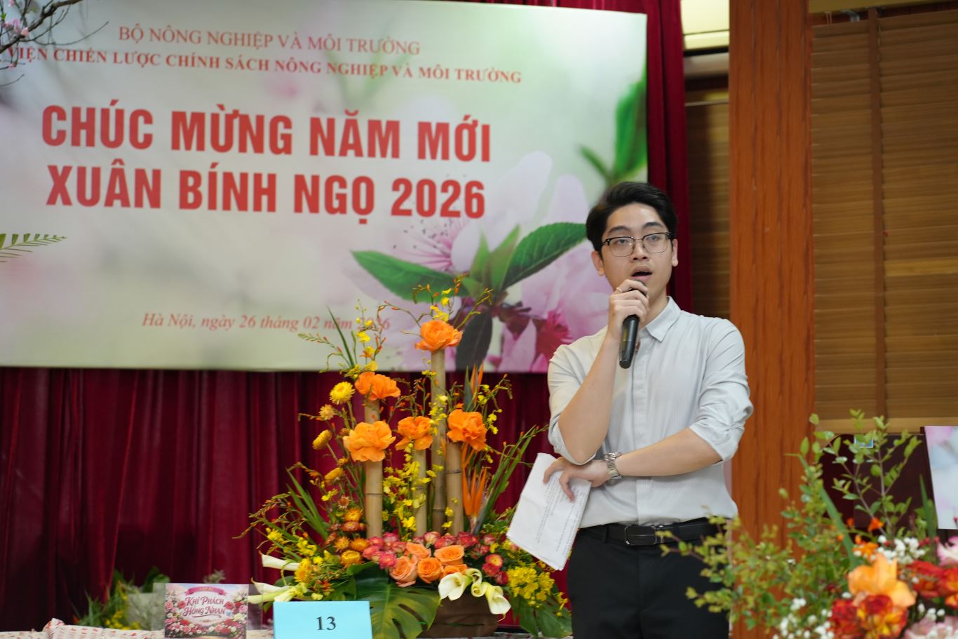 Đại diện Trung tâm tư vấn CSNN, anh Đỗ Gia Phong thuyết trình về tác phẩm số 13 mang tên “Khí phách hồng nhan”. Tác phẩm sử dụng những ống tre vươn thẳng làm trục chính, biểu tượng cho sự dẻo dai, bền bỉ và bất khuất của dân tộc Việt Nam. Những đóa hoa sắc cam, đỏ rực được sắp đặt xen giữa các trụ tre, tượng trưng cho nhiệt huyết, đam mê và khát vọng vươn lên. Qua đó, tác phẩm tôn vinh hình ảnh người phụ nữ Việt Nam: mềm mại nhưng mạnh mẽ, giàu ý chí và luôn tỏa sáng theo cách riêng của mình.